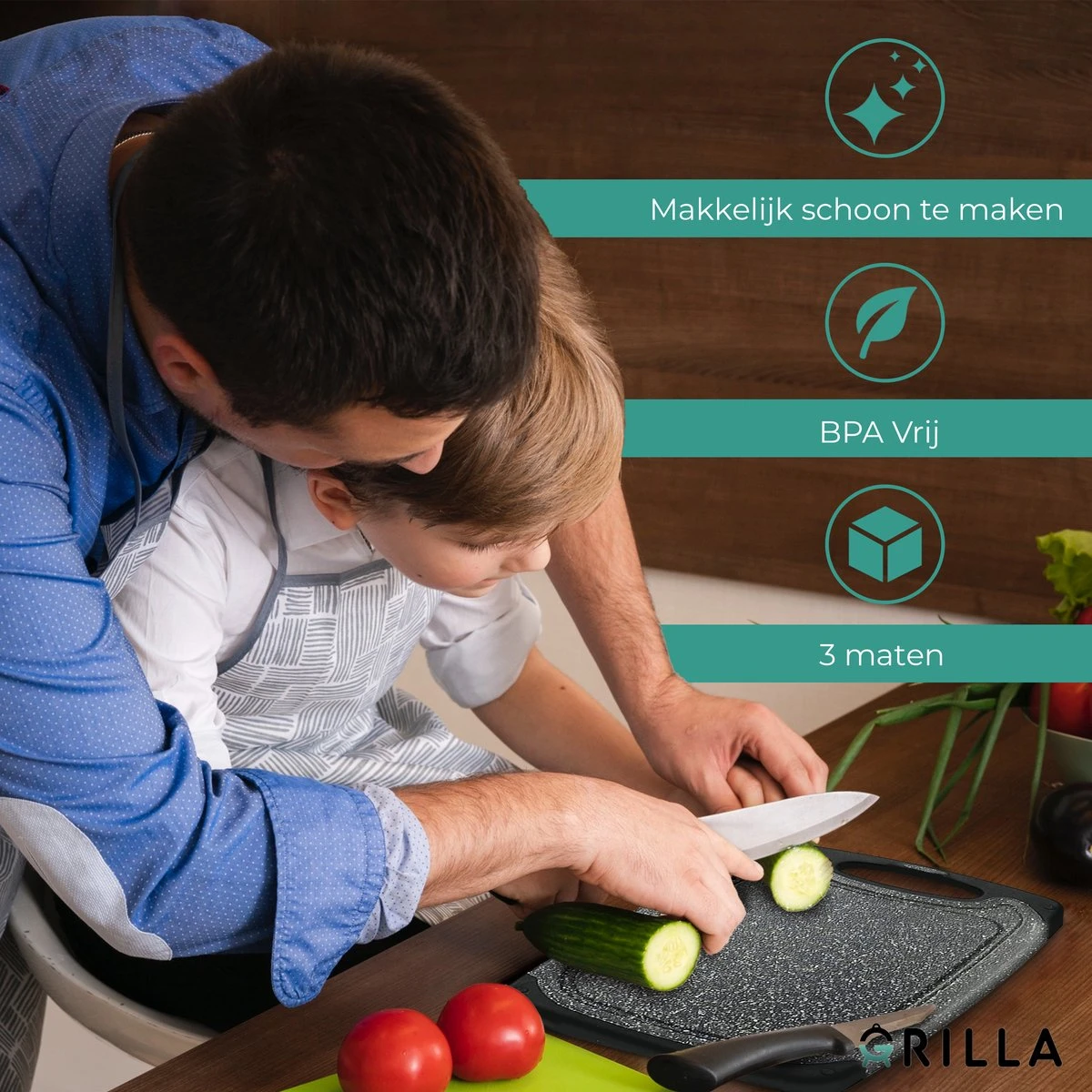 een kleine snijplank voor fruit, een middelgroot bord voor kleine hak en snijtaken en het grote bord tijdens het bereiden van feestmaaltijden. Voor elke gelegenheid de perfecte snijplank zo bij de hand!