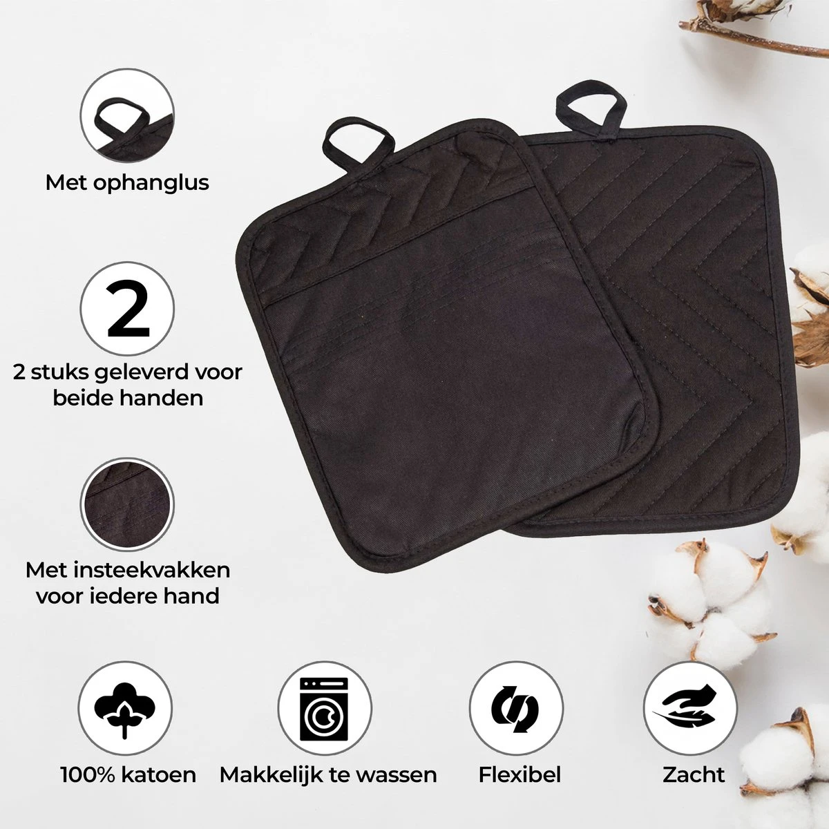 De Roegaarden Pannenlappen zijn verkrijgbaar in drie verschillende kleuren namelijk; Groen, Grijs en Zwart. Kies de kleur Pannenlappen die het best bij jou in de keuken past.