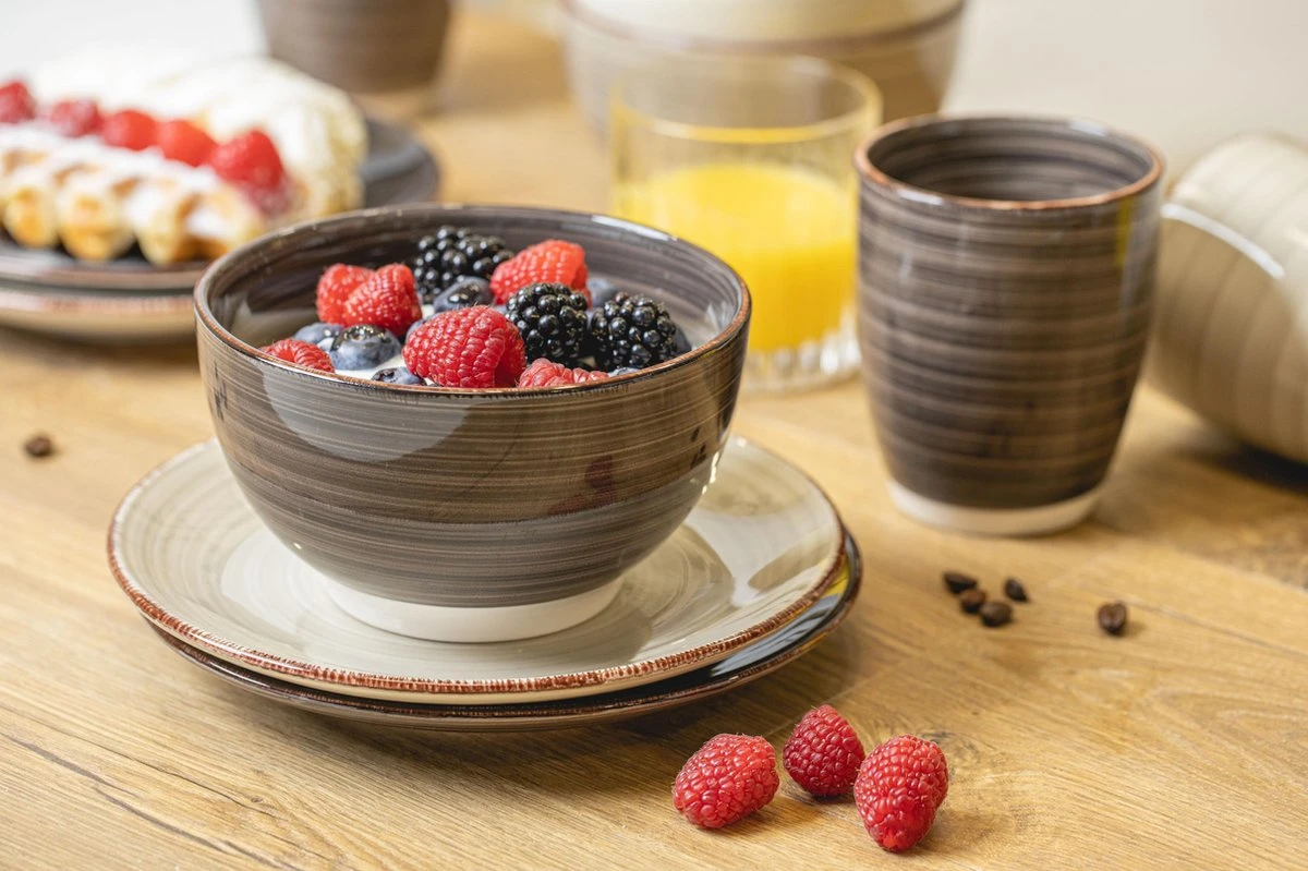 Studio Tavola Kom Vintage Loft Ø 14 cm – 6 StuksGeef je tafel een stoere, vintage look met deze kommen! Wil je graag een keer iets anders dan je standaard witte servies, maar wil je niet teveel uitpakken? Deze kommen zijn dan ideaal voor jou. De prachtige neutrale kleuren zijn anders, maar vallen zeker niet teveel op. Let wel op: deze kommen worden gemixt geleverd, er kan dus geen kleur gekozen worden. Combineer de kommen met bijvoorbeeld de ontbijtborden, bekers of dinerborden, of kies juist voor heel ander servies.